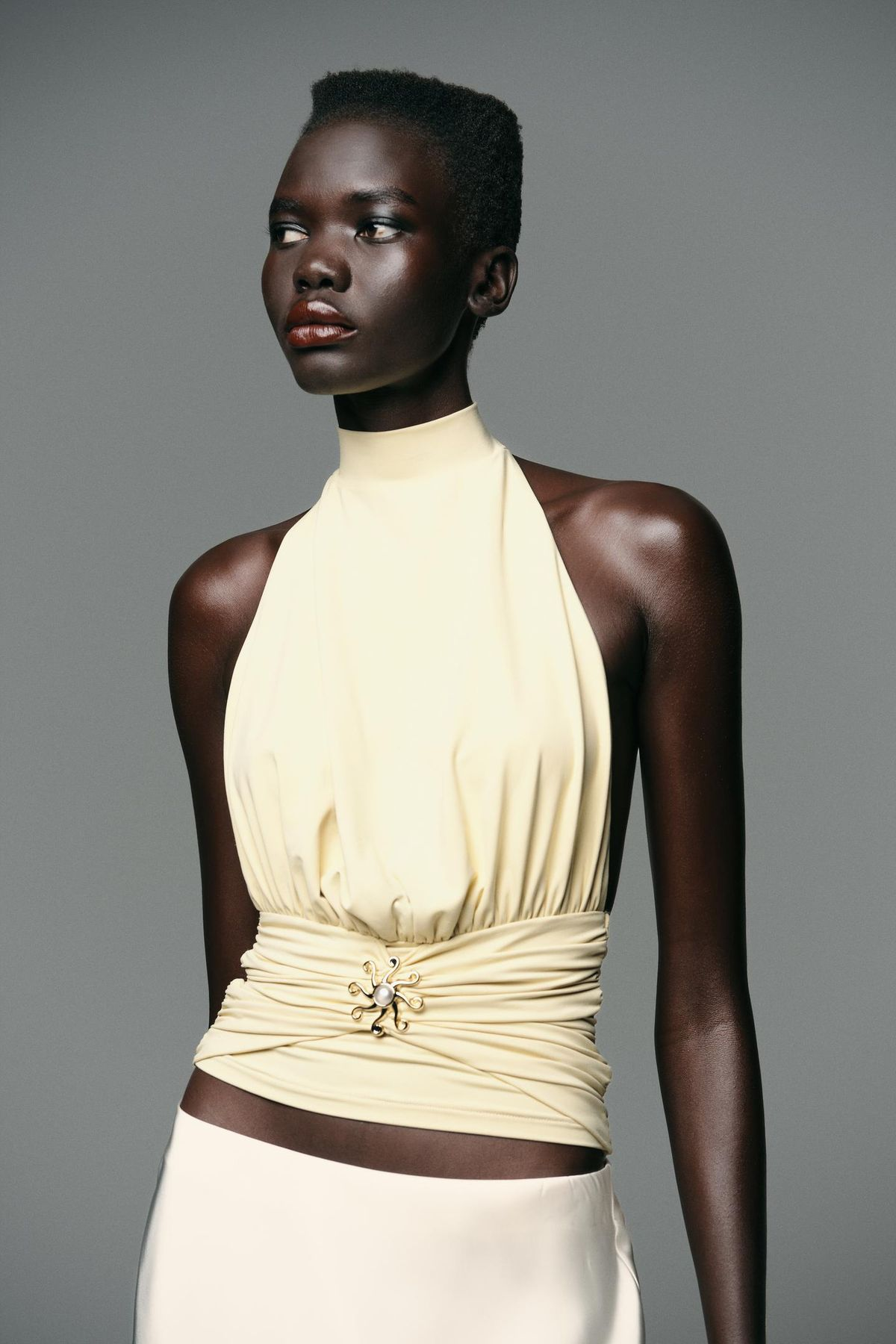 La Blusa Solé es una prenda diseñada para resaltar la silueta con elegancia y fluidez. Su confección en acetato aporta una textura firme y suave al tacto, mientras el drapeado frontal y el amarre al cuello le otorgan un aire sofisticado. El fajón arruchado en la cintura realza la figura y el detalle del broche frontal con forma de Sol completa una propuesta moderna y femenina.
