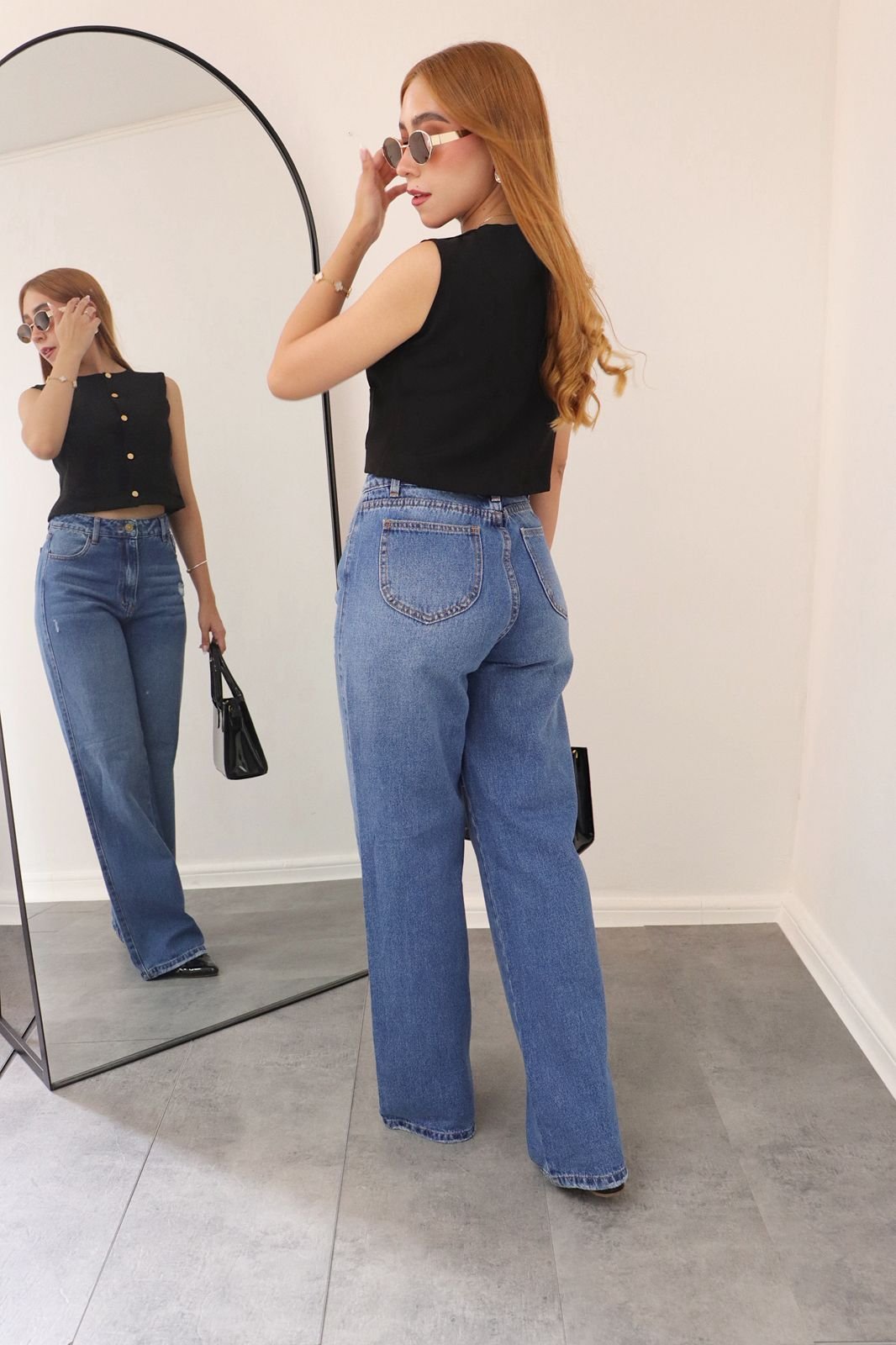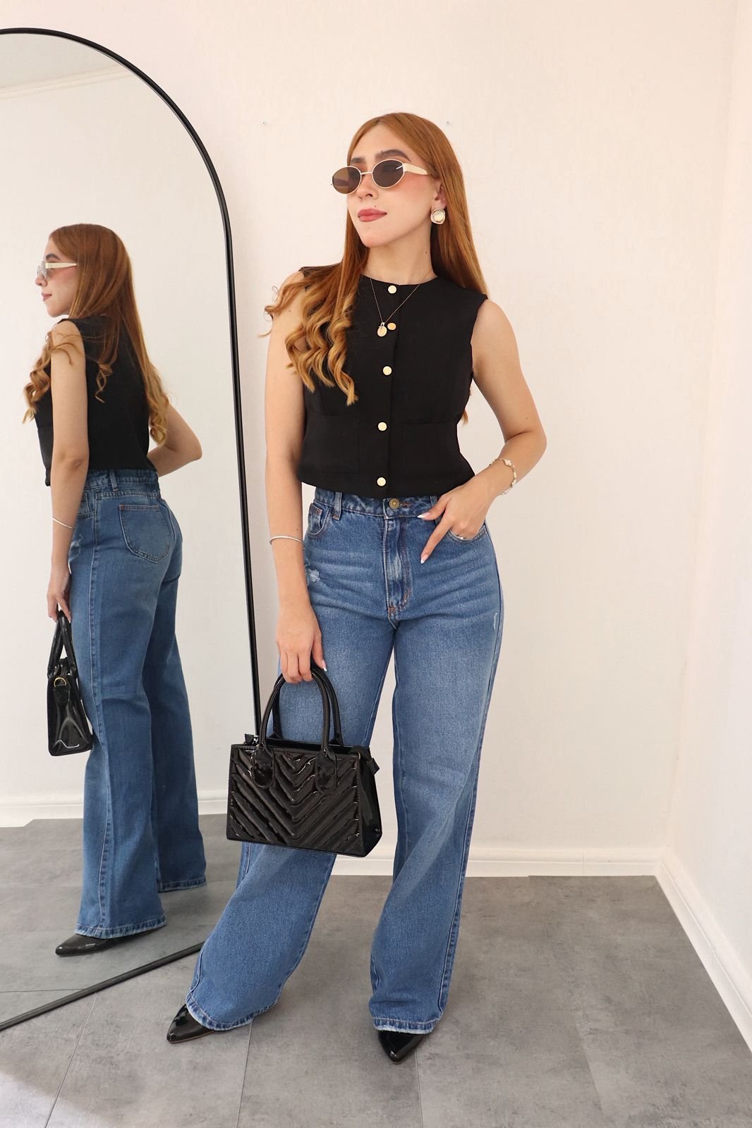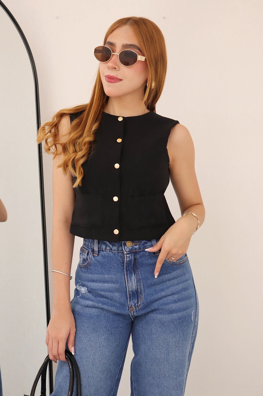 Chaleco Martina elaborado en noche de Viena, con dos bolsillos funcionales y botones dorados que aportan un toque refinado. Sus costuras estratégicas realzan la figura, creando una silueta elegante, moderna y versátil para múltiples outfits.