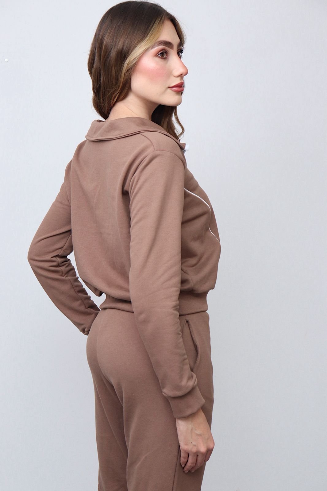 Chaqueta de diseño moderno y femenino, confeccionada en tela suave y cómoda al tacto. Cuenta con cierre frontal completo que facilita su uso y detalles en contraste que estilizan la silueta. Su cuello alto aporta un toque elegante y funcional, ideal para proteger del frío ligero. Disponible en talla S y M.