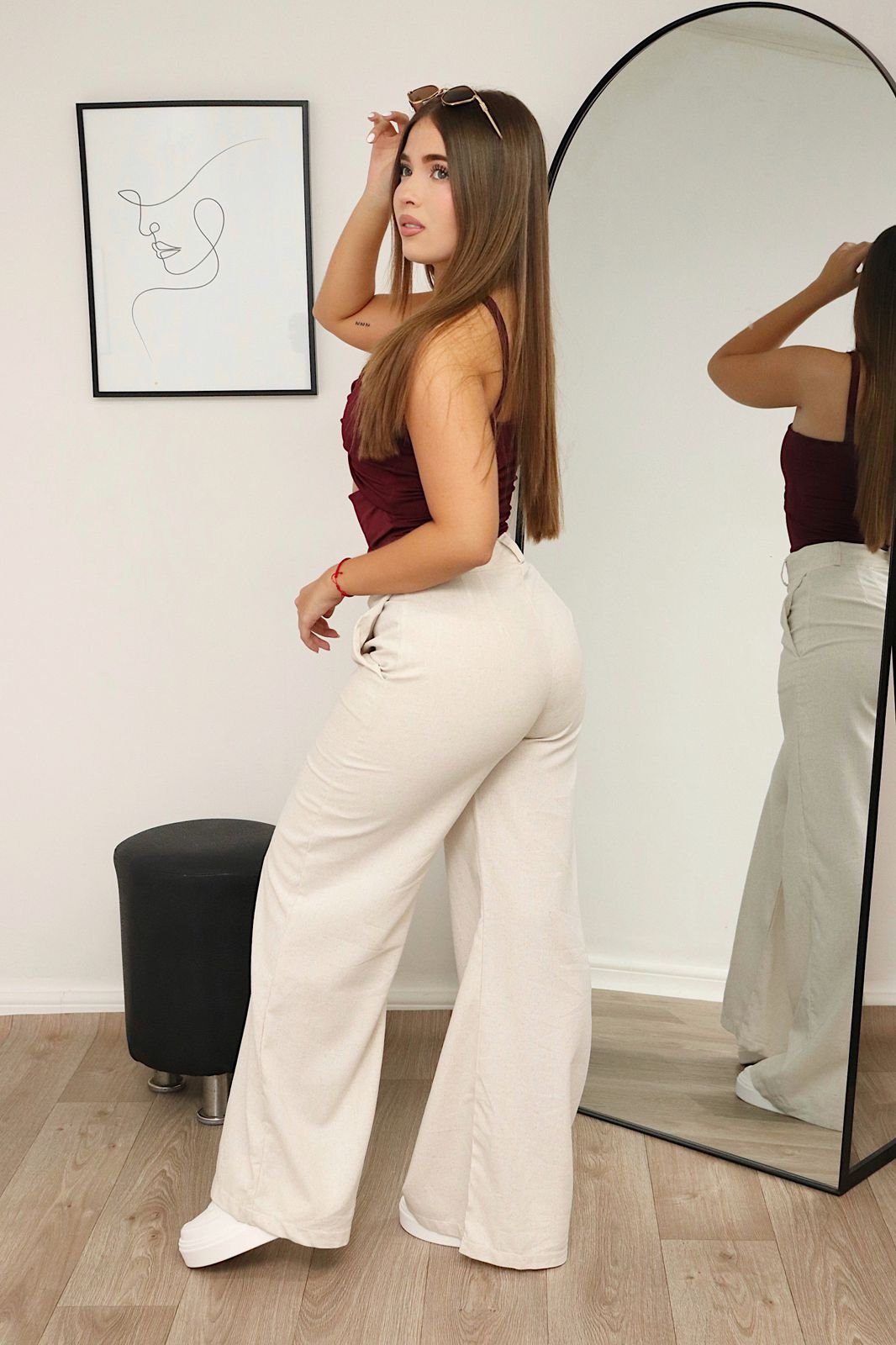 El Pantalón Alessia es un palazzo de tiro alto con silueta amplia y caída fluida, elaborado en lino ligero que aporta frescura y movimiento. Su diseño estiliza la figura y lo convierte en una pieza versátil para distintos estilos y ocasiones.