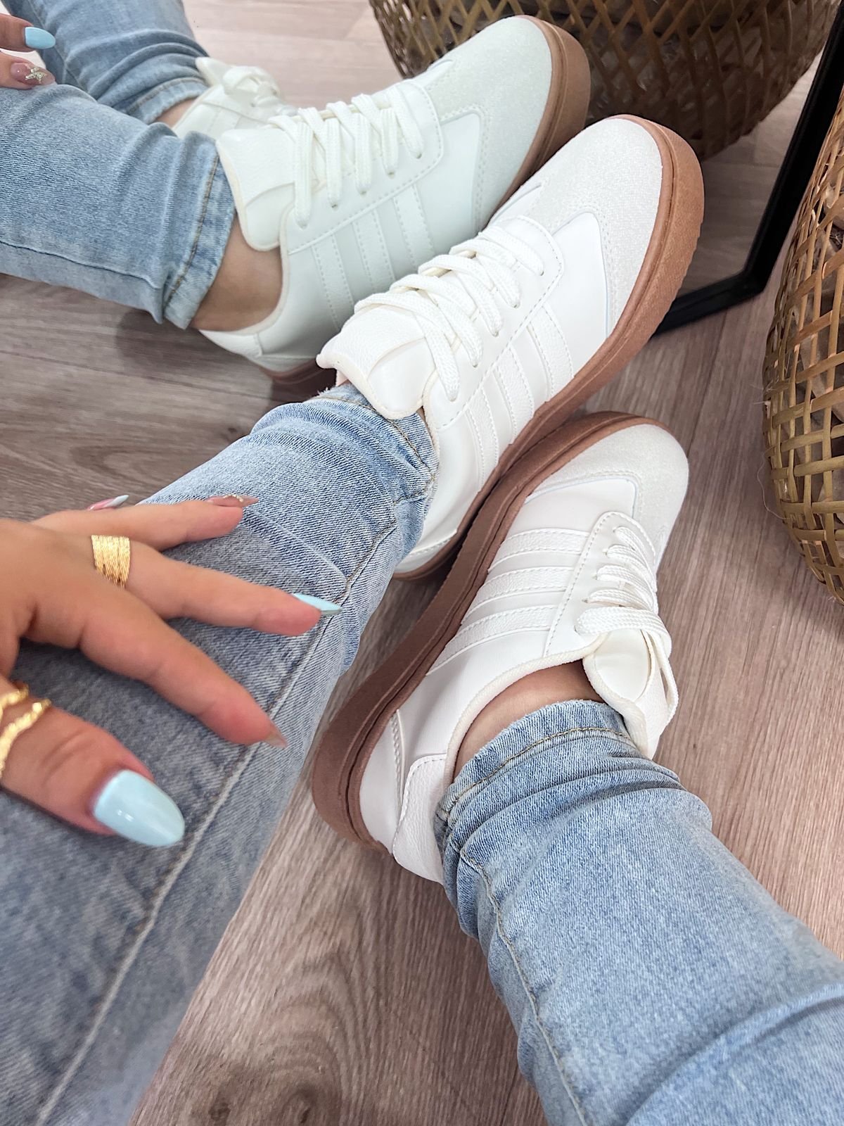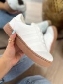 Estos tenis blancos destacan por su diseño limpio y versátil, perfectos para acompañarte en cualquier momento del día. Su silueta bajita y suela color café ofrecen una pisada cómoda y estable, mientras que sus materiales suaves garantizan confort desde el primer uso. El detalle de la línea lateral aporta un toque moderno y discreto, y la gamuza en la parte frontal eleva el diseño con una textura elegante y actual. Un modelo fácil de combinar, pensado para quienes buscan comodidad, estilo y un acabado cuidado en cada detalle.