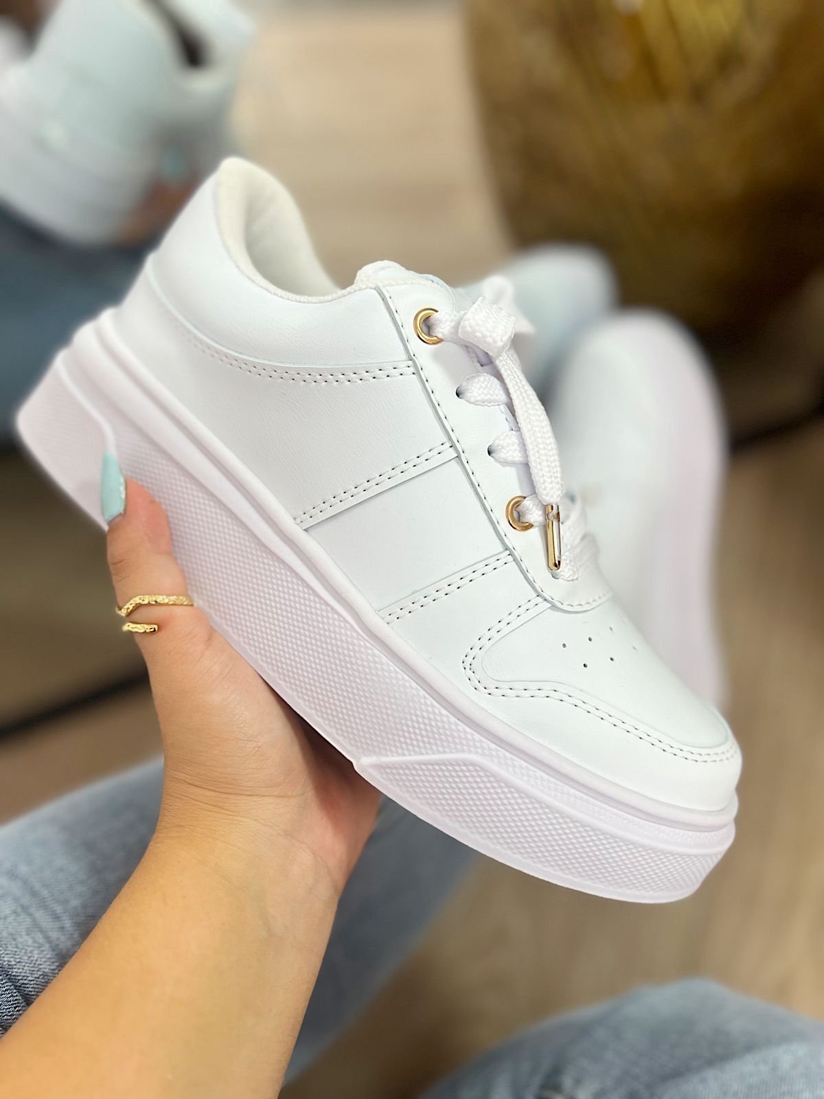 El Tenis Soho es ese básico infaltable que eleva cualquier look. Su diseño clásico en tono blanco y su suela baja ofrecen una combinación perfecta de comodidad y estilo minimalista, ideal para el uso diario.El detalle protagonista es su ojal dorado entre los cordones, un acento sutil que rompe lo convencional y le da personalidad sin perder elegancia. Gracias a su horma nacional, brinda un ajuste cómodo y seguro desde el primer uso. Un tenis versátil, moderno y fácil de combinar, pensado para acompañarte en cualquier plan.